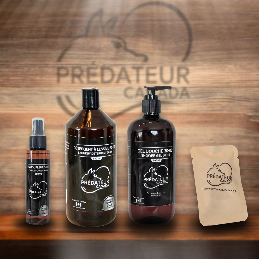 Les produits de Prédateur Canada ont été conçus pour réduire considérablement cette empreinte olfactive. En traitant vos vêtements, votre corps et votre équipement avec des produits spécialisés à base d’ingrédients naturels et de phéromones synthétiques, vous neutralisez les odeurs humaines et vous les remplacez par une odeur douce, forestière et familière pour le gibier.